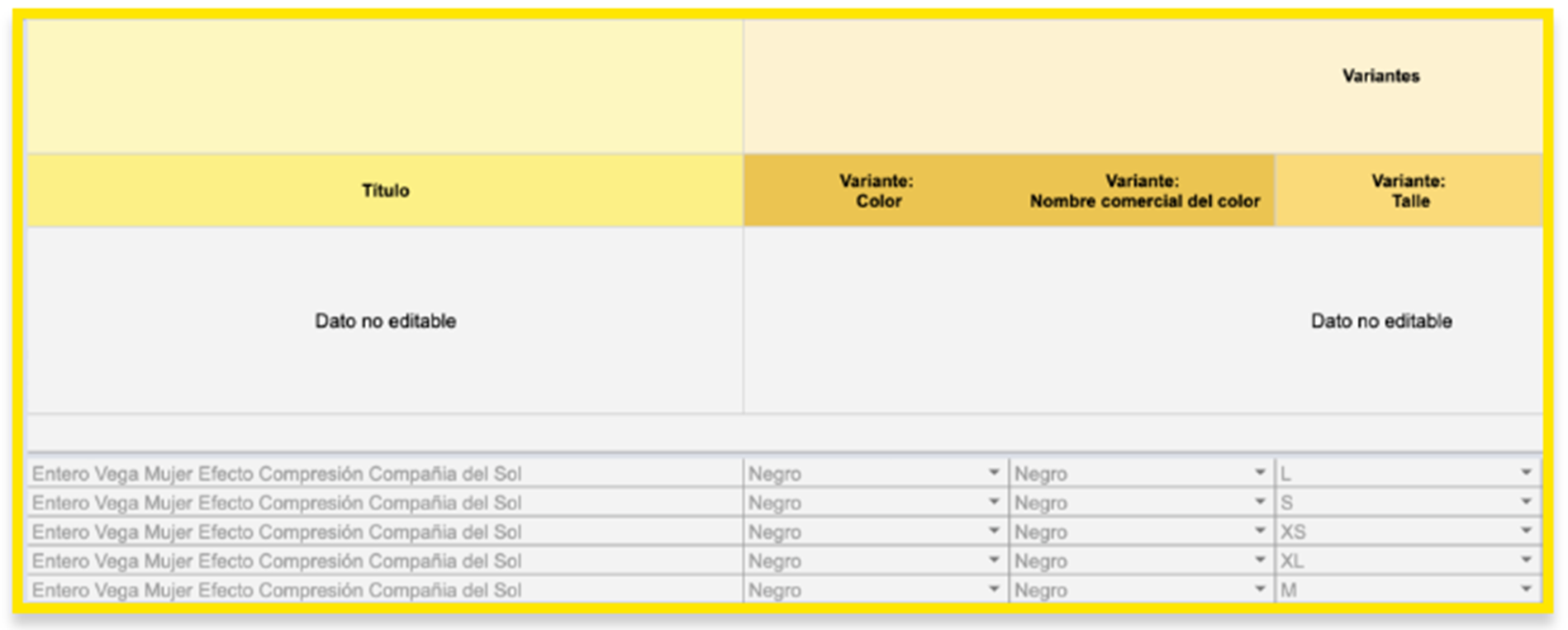 大多数时尚类产品都有特定的变体,如:颜色、尺码等。表格上传示意图如下: